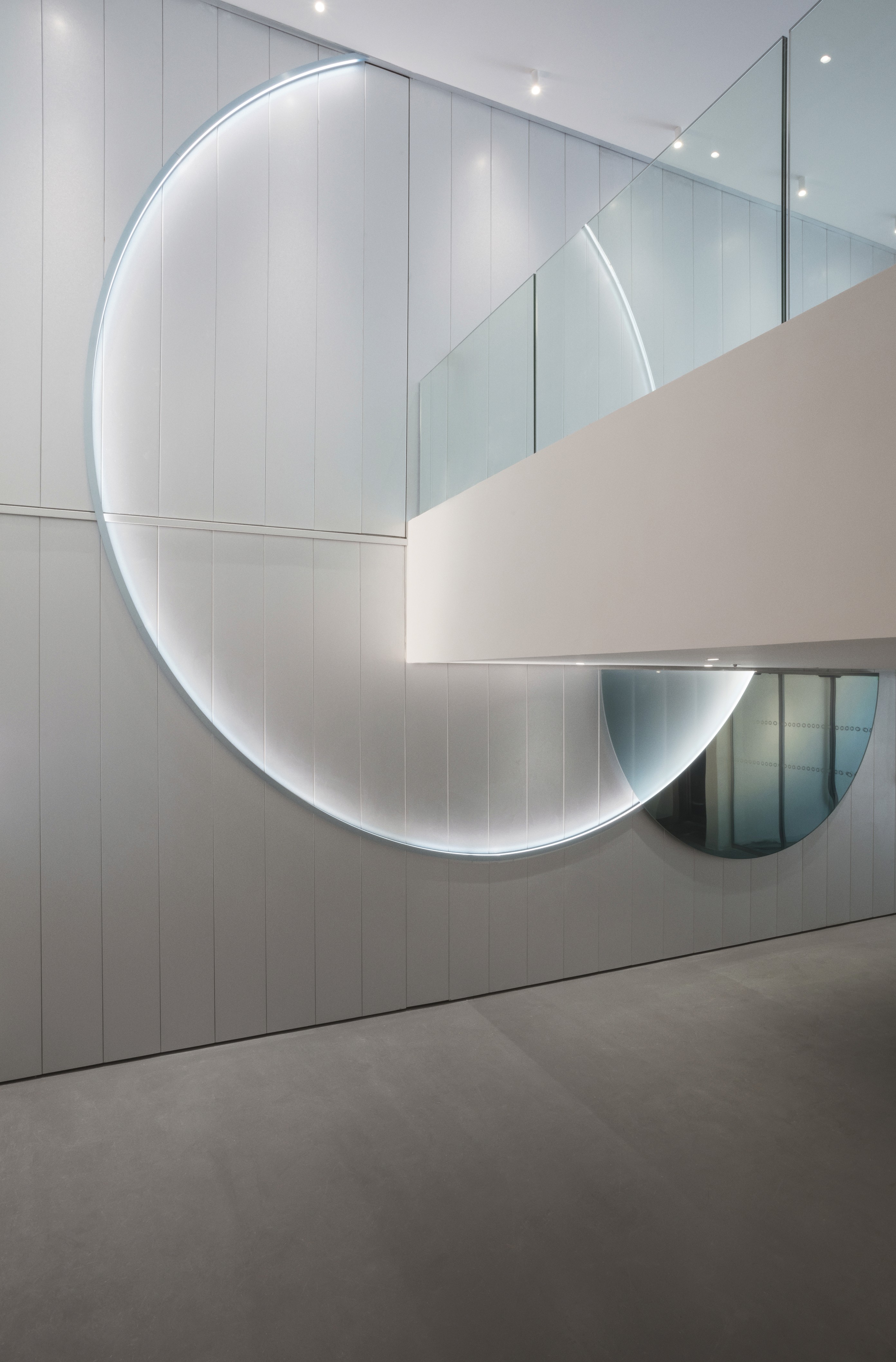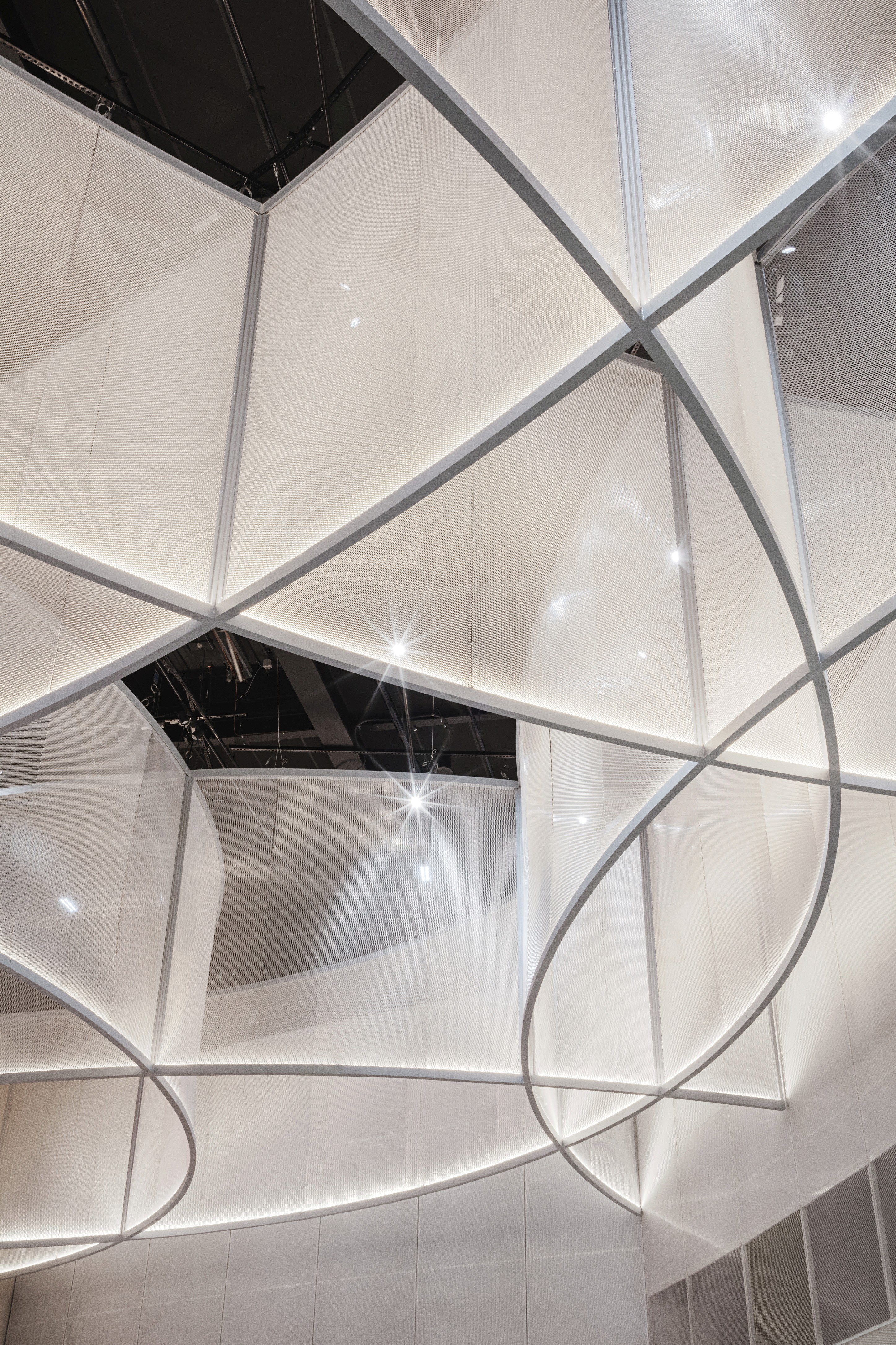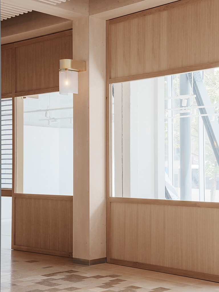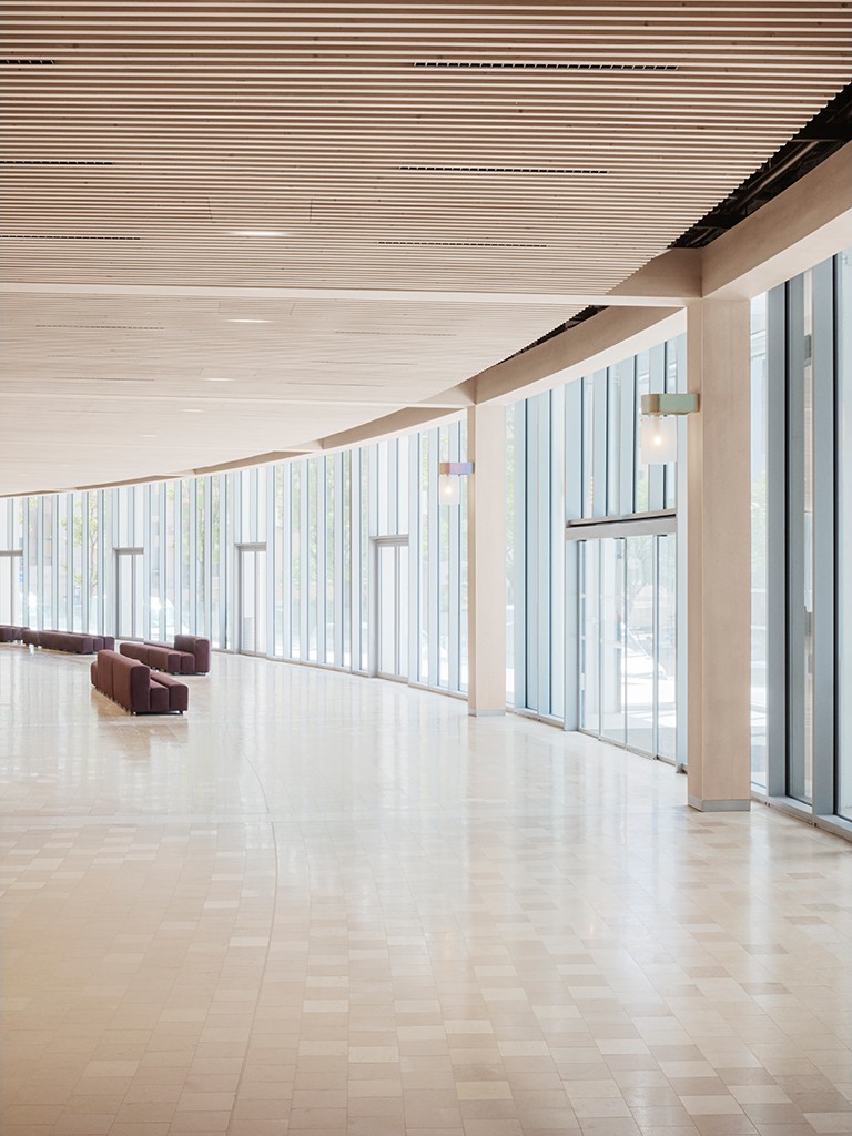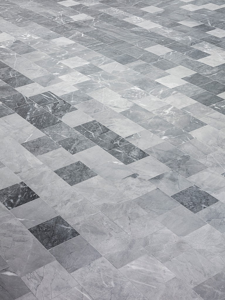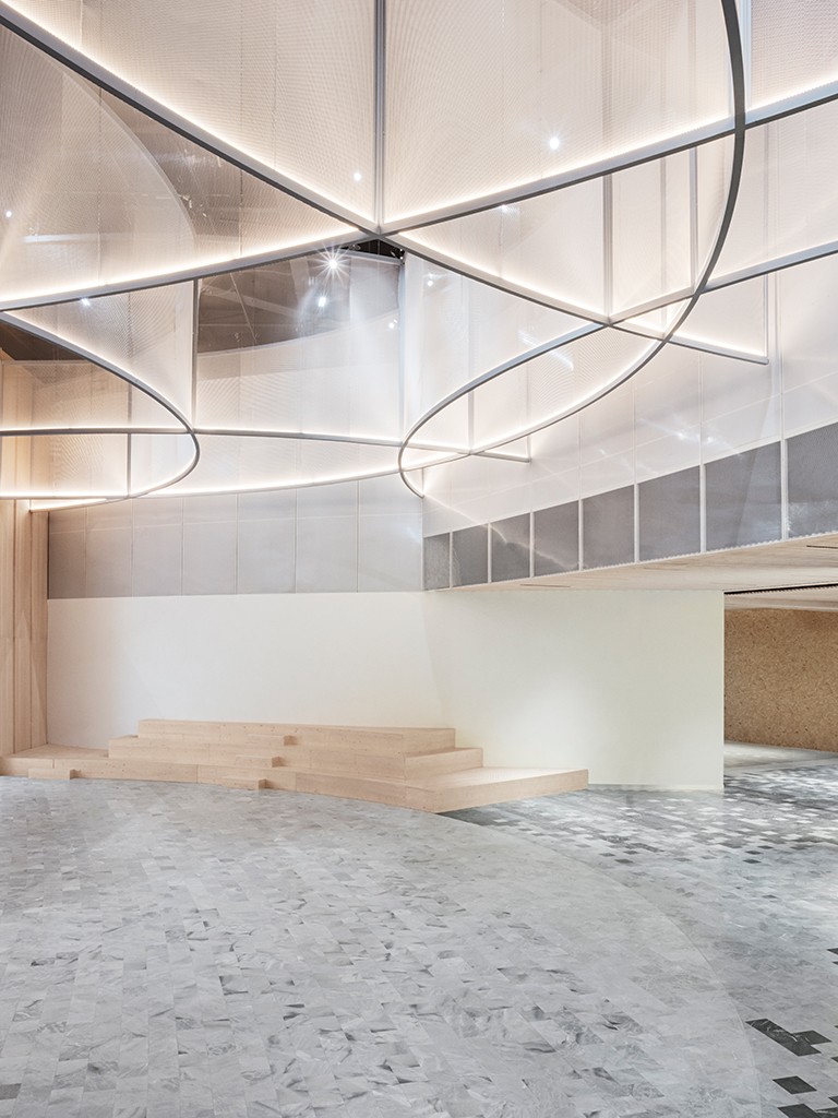 To create a seamless experience while passing through or shopping at the Galeries Lafayette, and to create a connection between the existing architecture and new interiors, elements of the iconic building from 1963 are enhanced by combining a custom-designed and locally sourced marble stone-floor pattern and a continuum of wood volumes, made from natural pine wood slats, and placed through the gallery’s curving shape. Creating a rhythm in the light entry, and a sense of place, in the beautiful surrounding landscapes in Annecy.