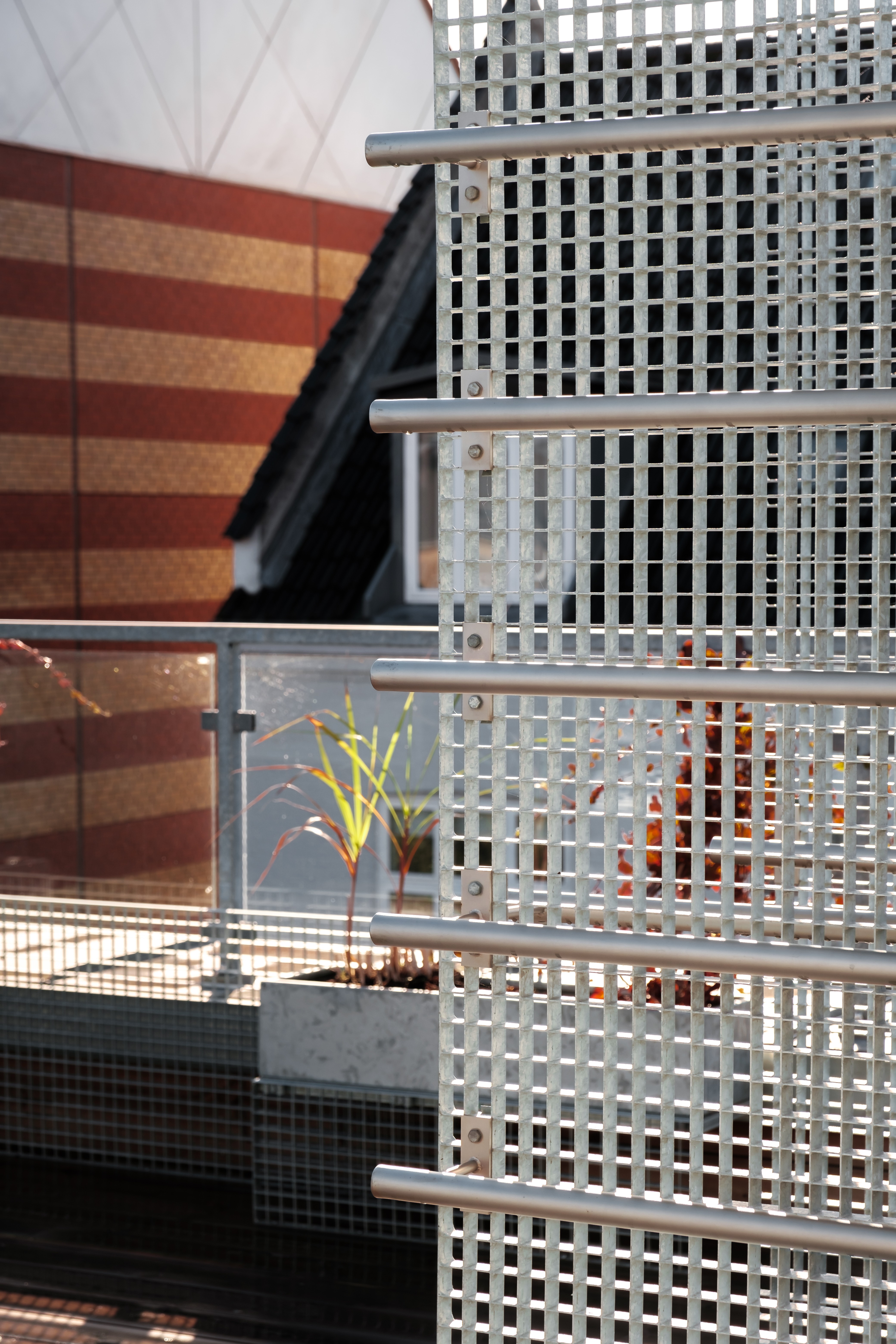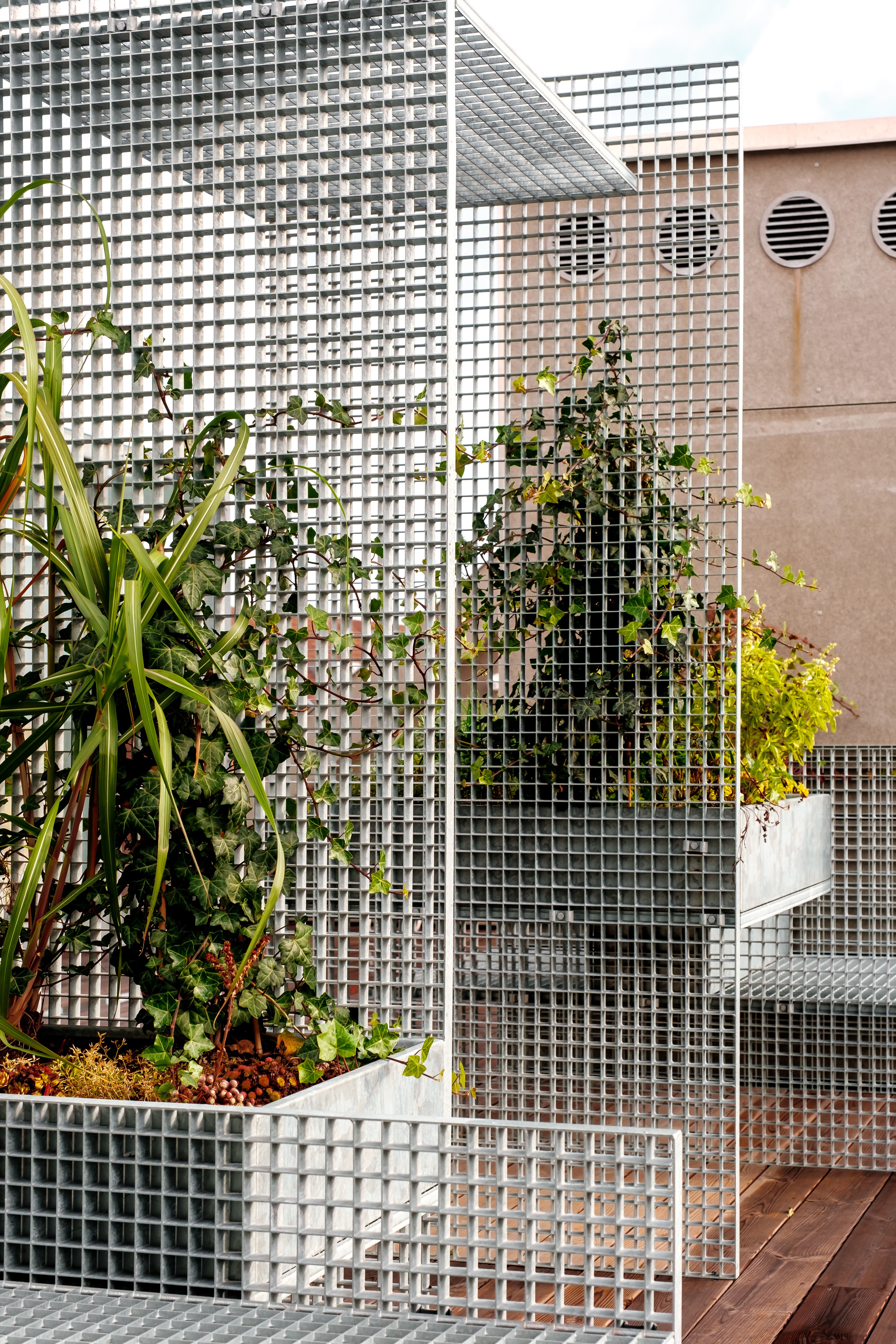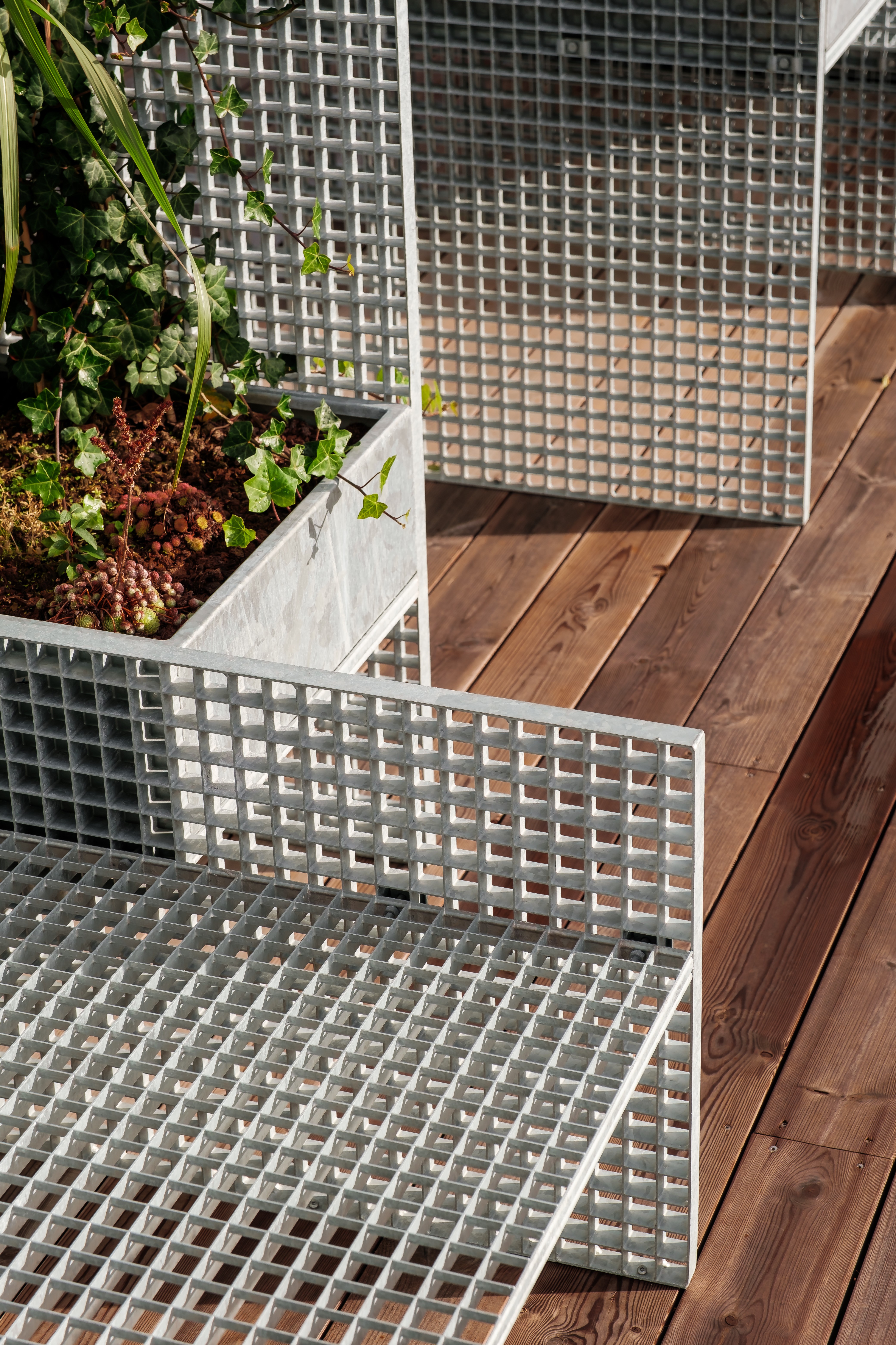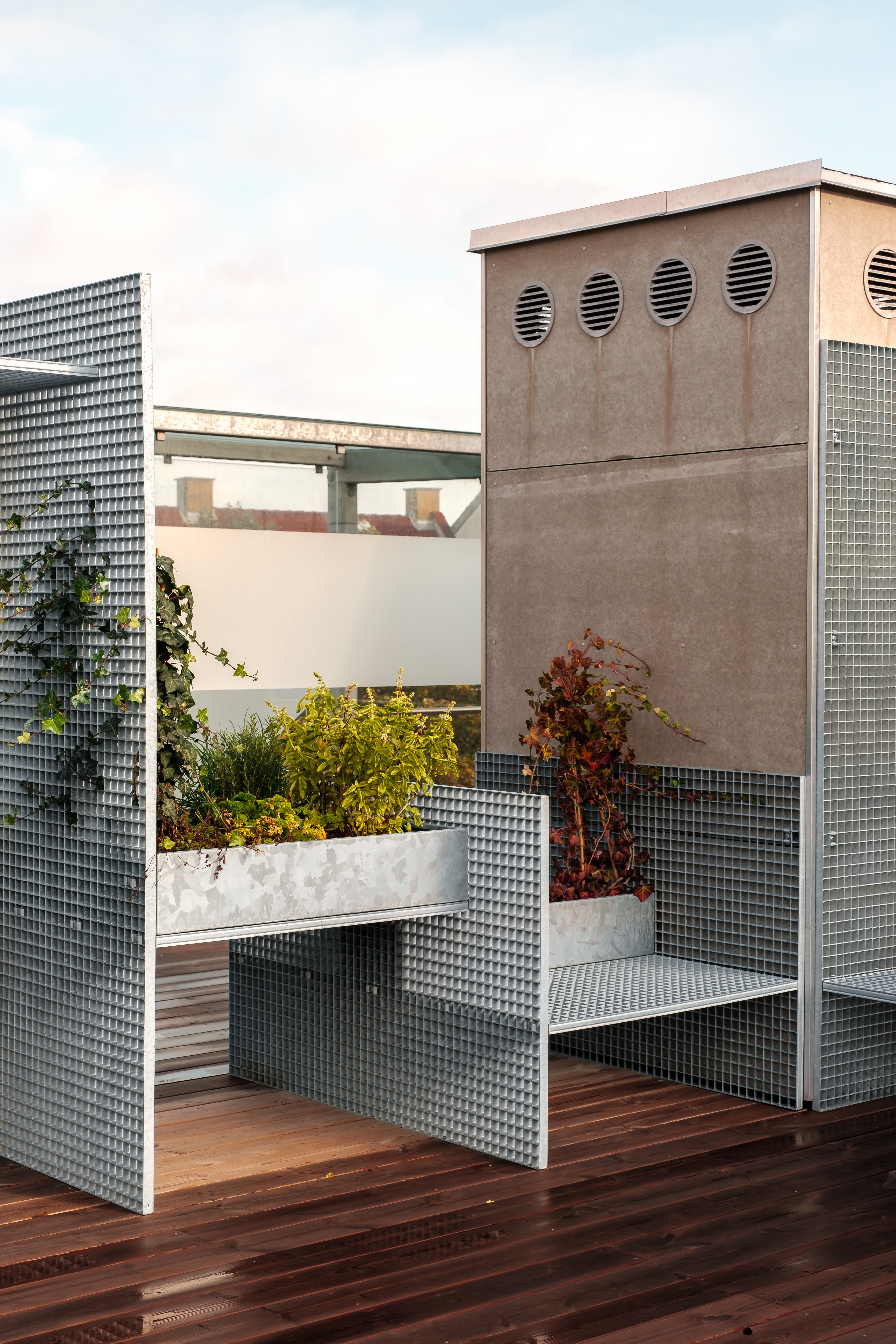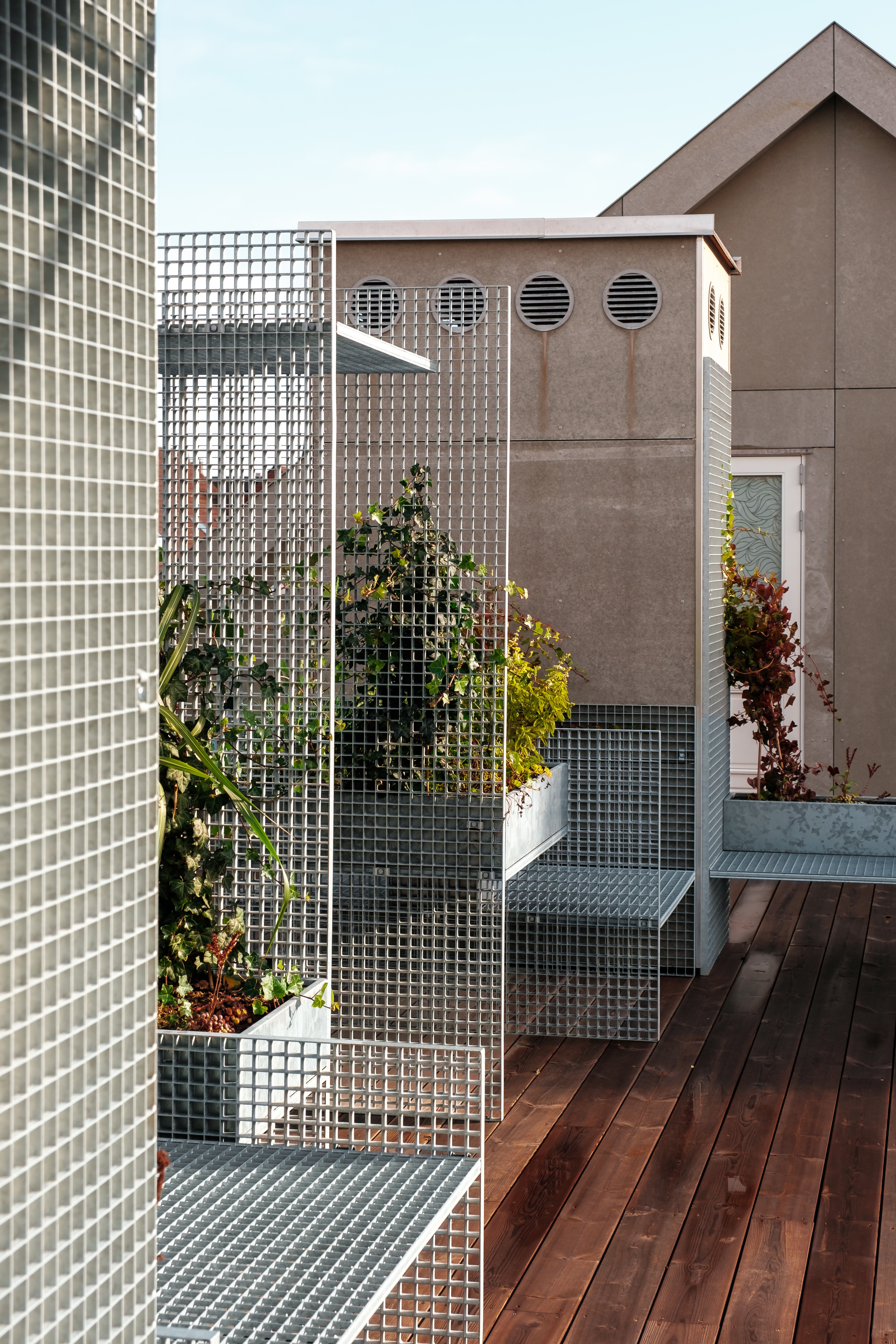 Instead of opting for a fencing off parts of the terrace, a counter-proposal was introduced. The idea was to transform the terrace into a multifunctional space, promoting alternative uses such as physical activities, herb gardening for cooking, or sunbathing in summer. The furniture is constructed from standard-sized elephant grates, harmonizing with the building’s aesthetic through the use of galvanized steel with a matching finish. The divisions vary in height and size to allow for different activities to be spread around the rooftop.