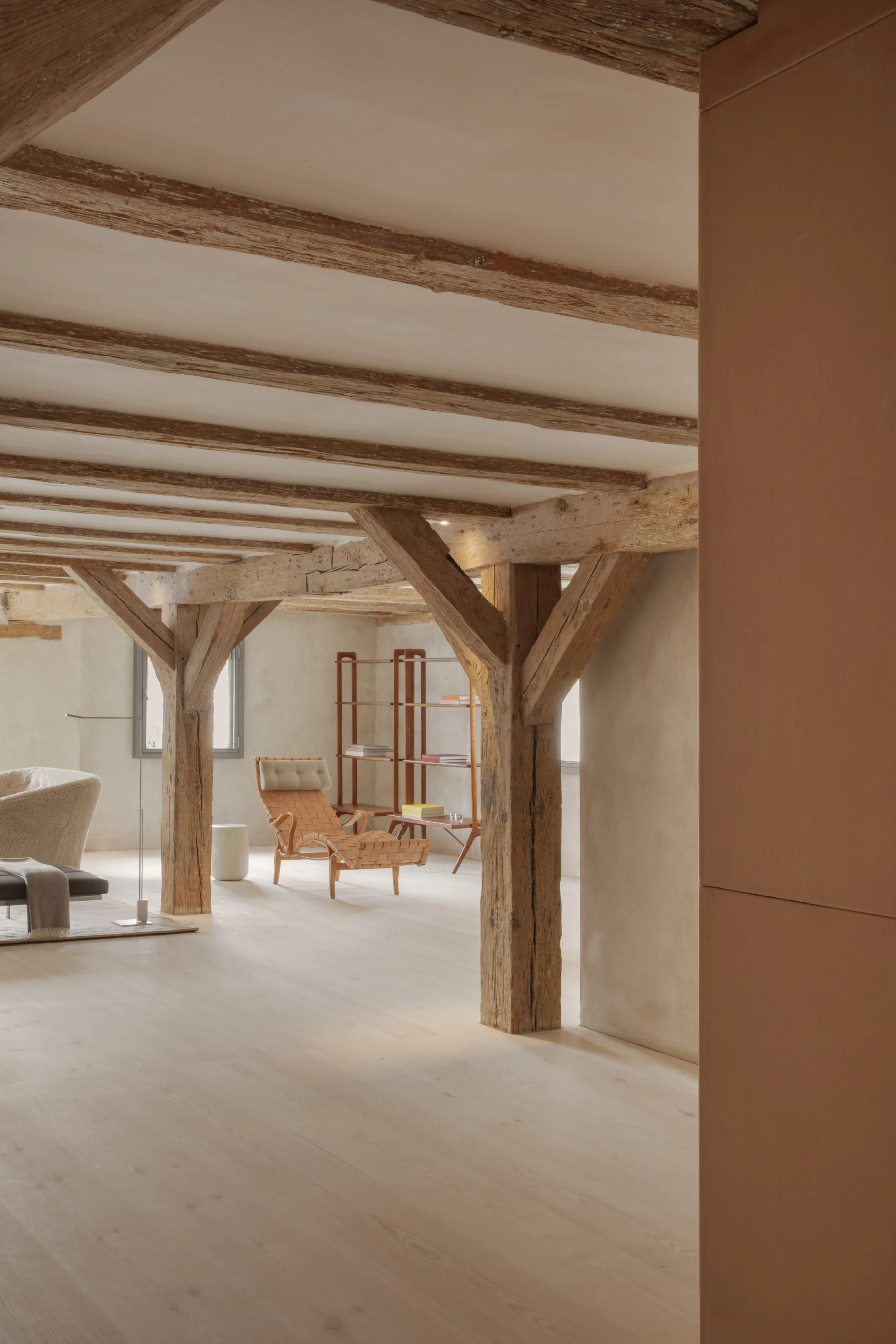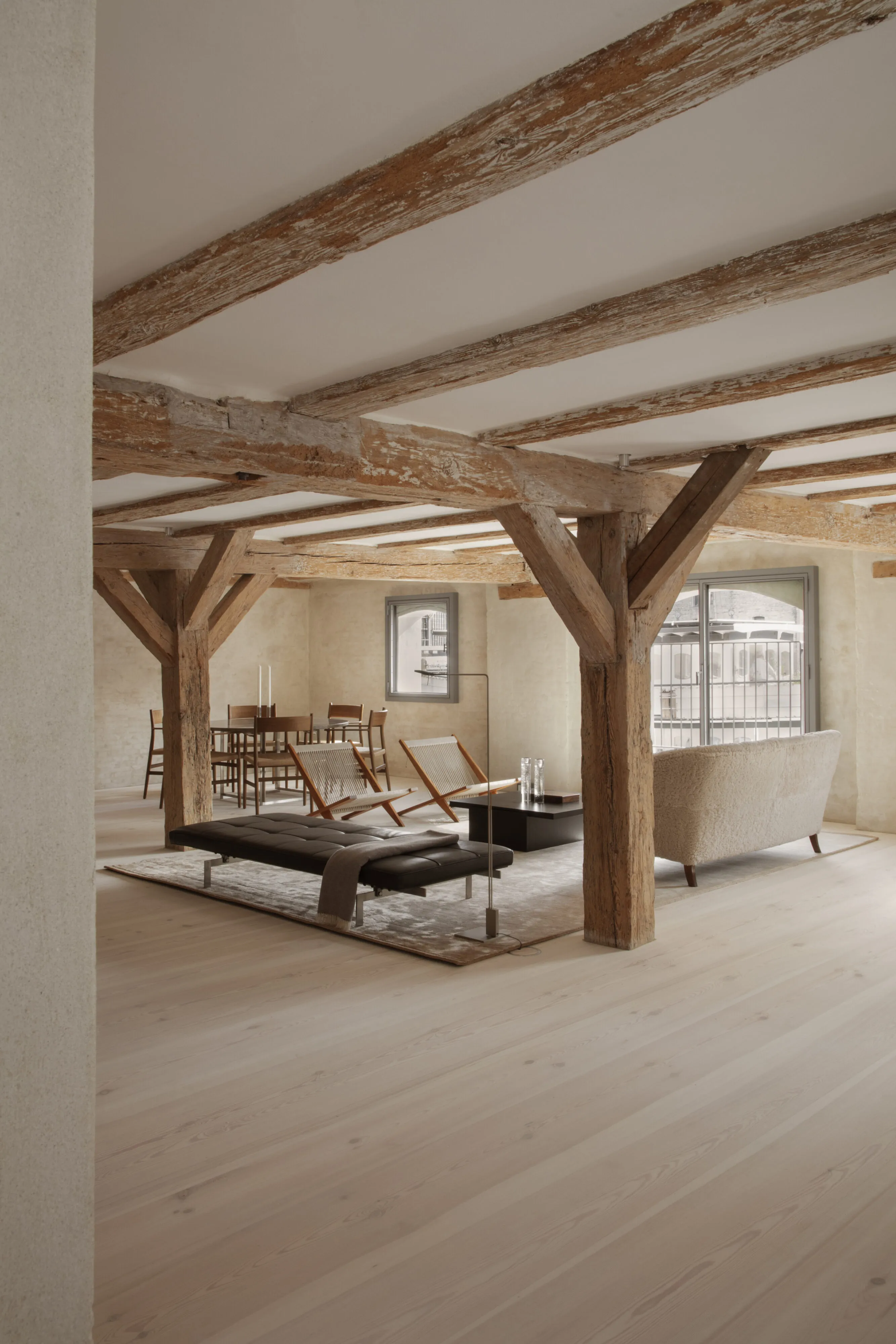 The architectural transformation of the 218-year-old hide warehouse at Strandgade 104 in Copenhagen exemplifies the fusion of historical integrity with contemporary luxury. This meticulous renovation converts the once-industrial space into four exclusive apartments, embracing the building’s rich heritage while crafting a narrative that bridges its past and future. A palette of natural materials including Dinesen wood planks enhances the beauty of the original structure, skillfully elevating its humble components. Sorensen Leather, sourced from the best producers in Denmark, is used to clad the lift, referencing the building’s history as a hide warehouse and instilling warmth and tactility into each apartment.