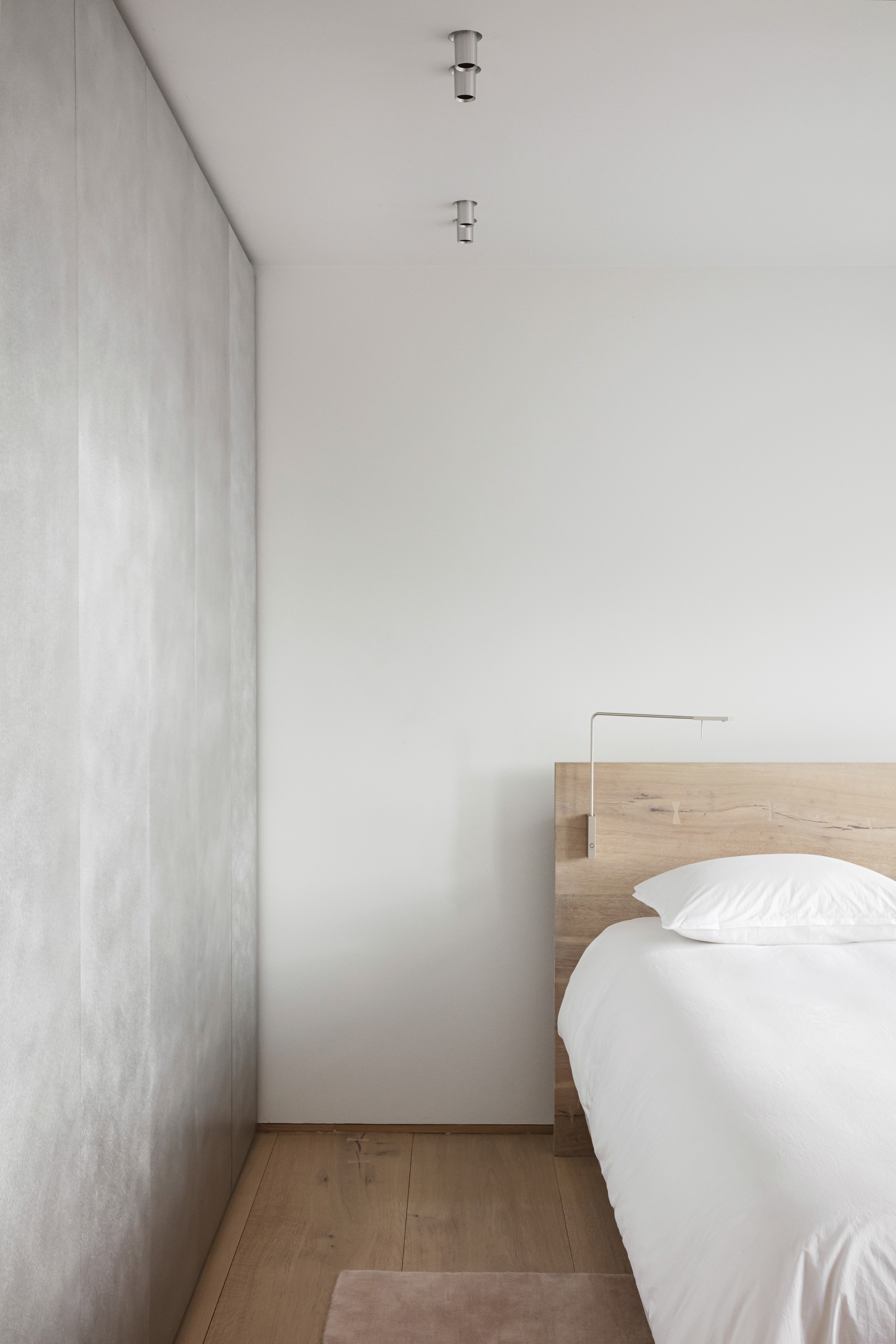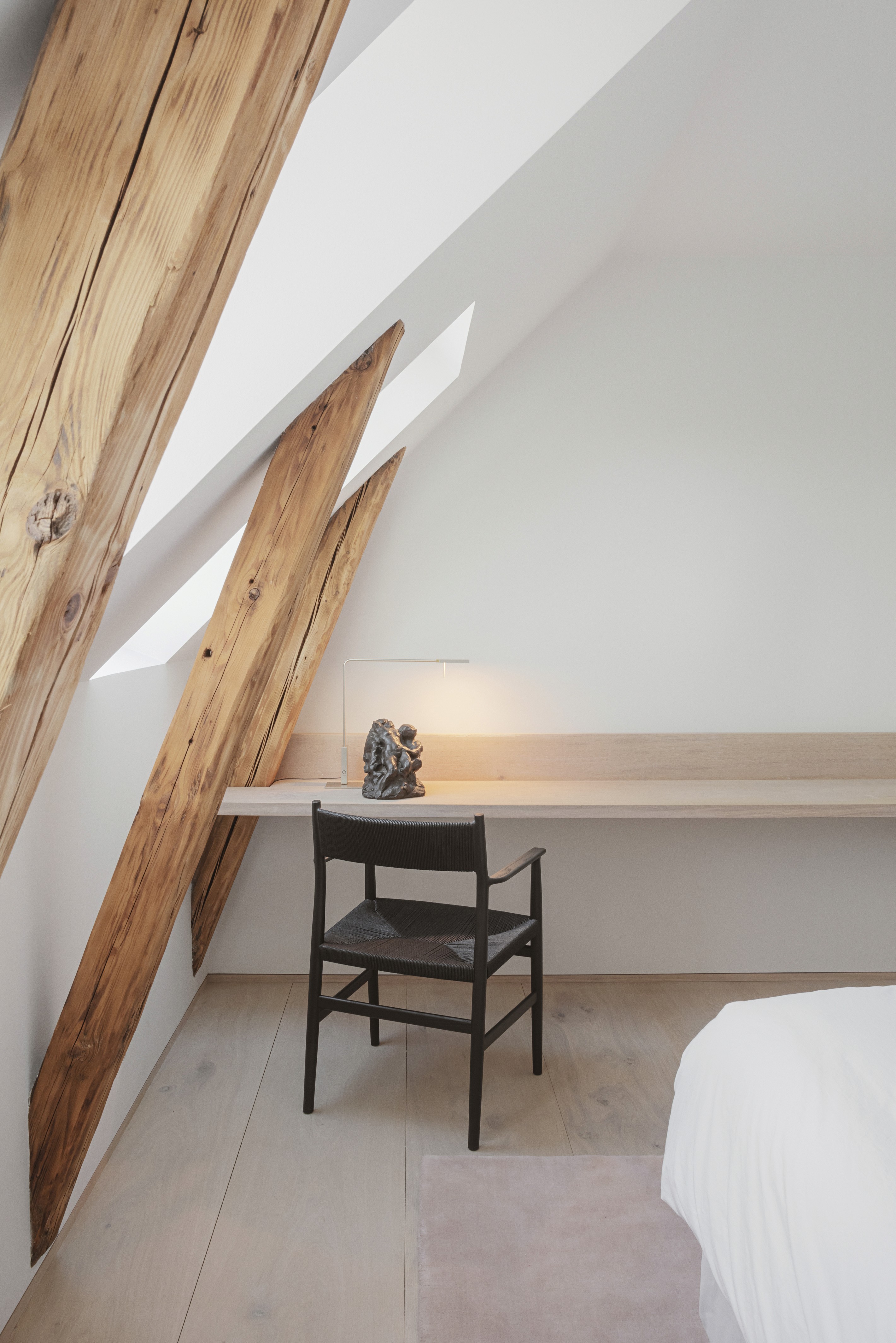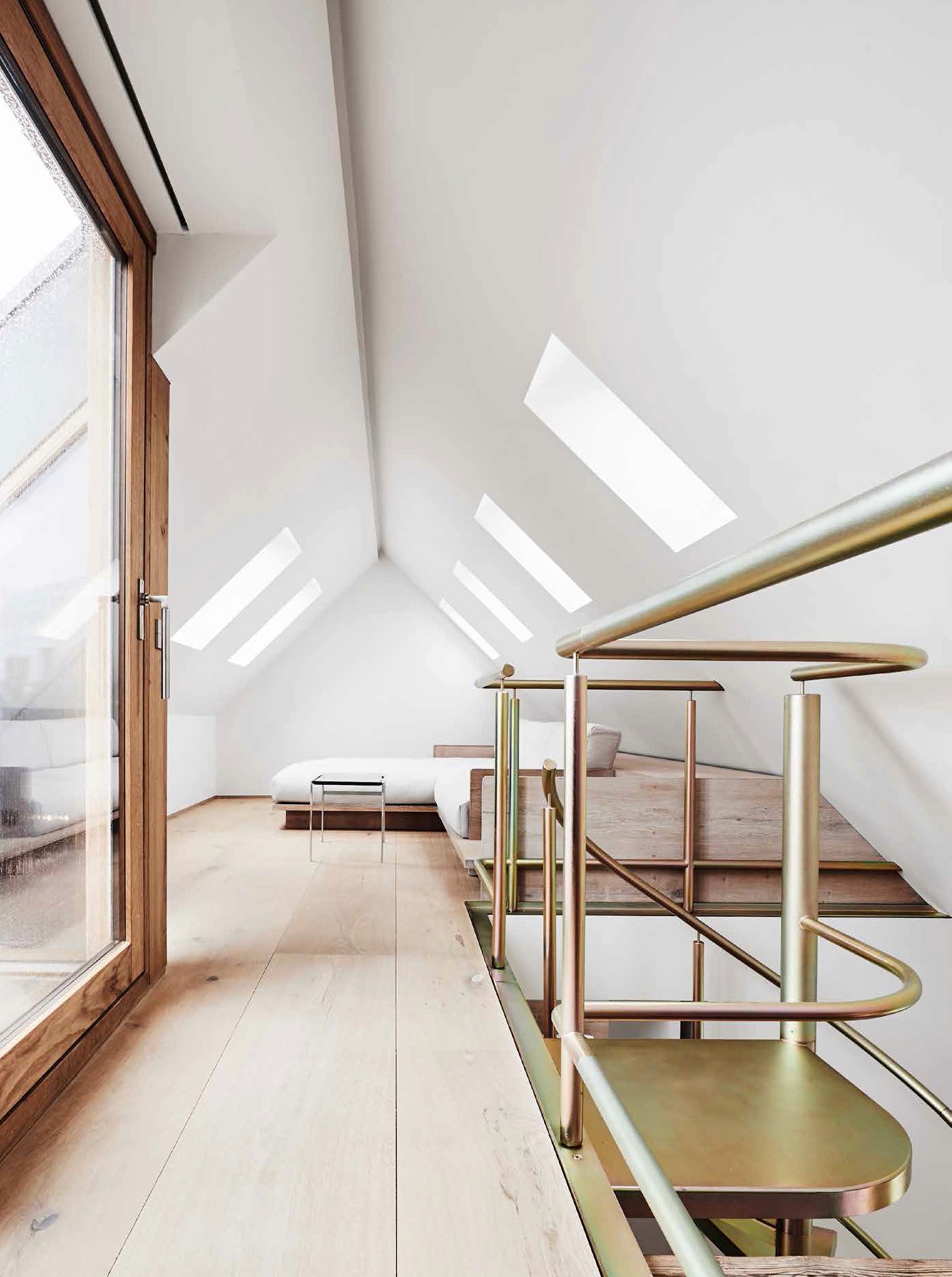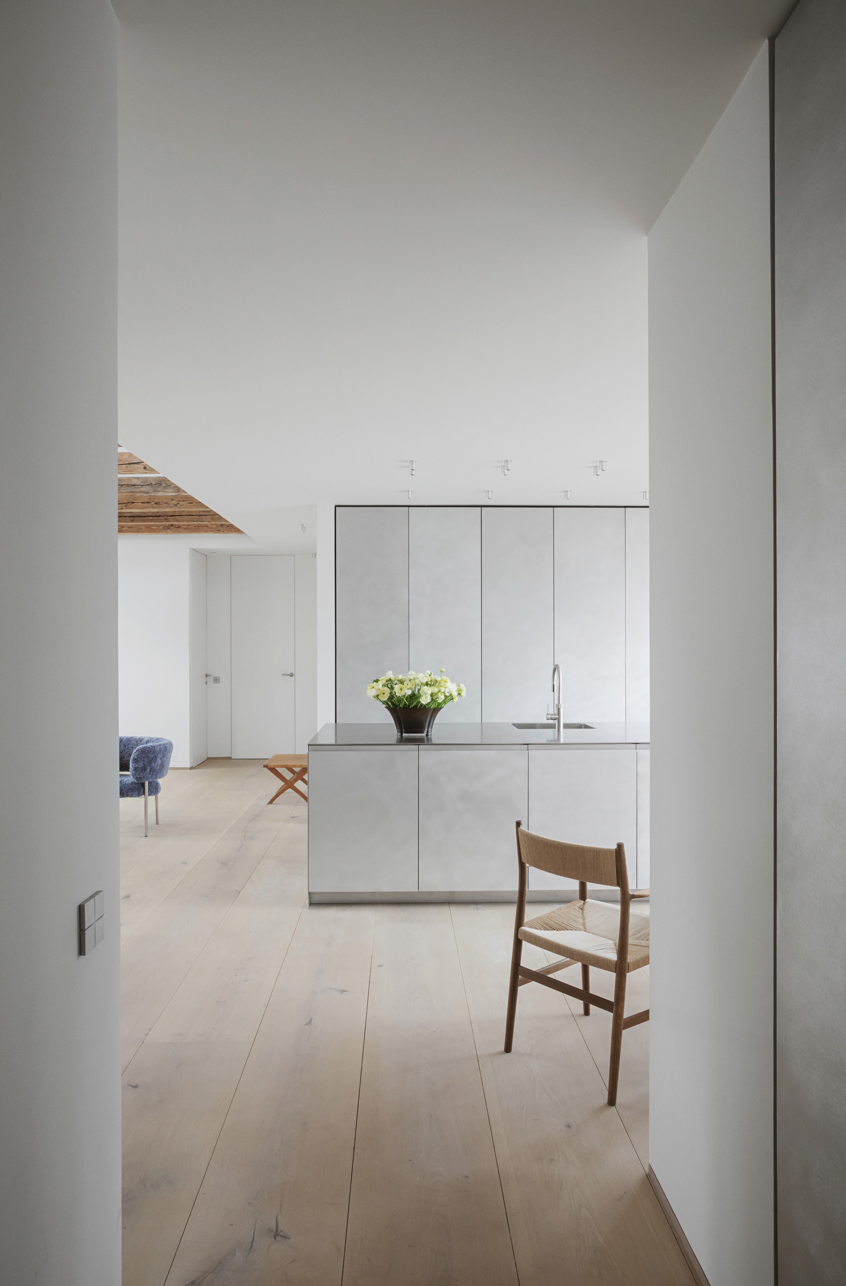 The owner’s acquisition of the attic space above their apartment welcomed a heroic double-height living area with exposed rafters that form a sculptural connection between the two levels. To enhance the new sense of height, the building’s original arched windows at the centre of the living space were elongated. For bigger impact and more room for natural light, walls were adapted to extend the living space in all directions without any dividers or doors. Additionally, large bi-folding glass doors open off the combined kitchen and dining space to a second terrace which feels like an extension of the room.